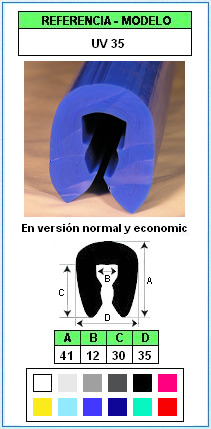 VARIANTE: Este perfil, con exactamente el mismo diseño y dimensiones, es posible suministrarlo también en versión ECONOMIC. Ésta variante, como su propio nombre indica, no incorpora todos los aditivos o elementos de la composición original, y por tanto, está especialmente indicada únicamente para aquellos casos en que no se precisen todas las características habituales de los perfiles estándar, tales como una permanencia inalterable de los colores originales, un nivel de elasticidad y prestaciones máximas, una durabilidad elevada, o una exposición constante a la intemperie y al ambiente marino. El pedido mínimo en el modelo ECONOMIC es de bobinas de 100 metros, por cada color. El pedido de esta variante ECONOMIC del modelo UV35, no se puede realizar por la Tienda On-Line, y es preciso contactar directamente con nosotros.