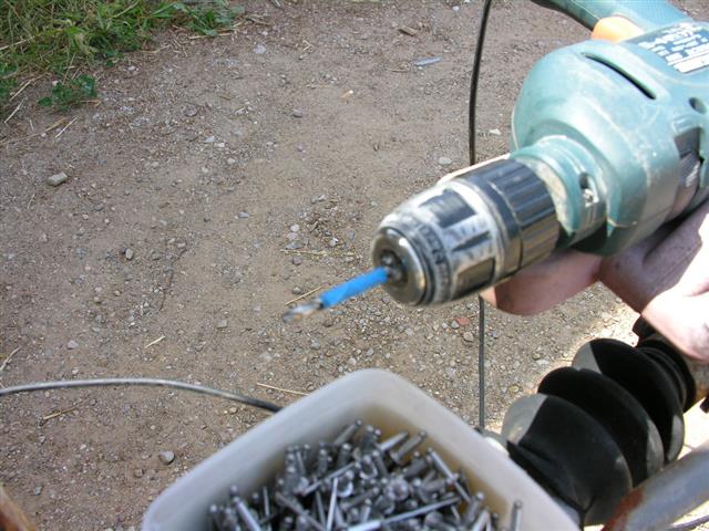 NOTA.- En este caso, dada la relativa poca profundidad de la superficie de fijación y la inminente cercanía del tapizado interior, resultó mucho más apropiado el uso de remaches, en lugar de los habituales tornillos de tipo "chapa" con cabeza cónica de INOX, a fin de evitar el riesgo de que sobresalieran las puntas por el interior. En casos así es recomendable marcar sobre la propia broca empleada la profundidad necesaria que precisamos de taladro, a fin de no excederse, evitando con ello el riesgo de provocar daños innecesarios en el tapizado interior.