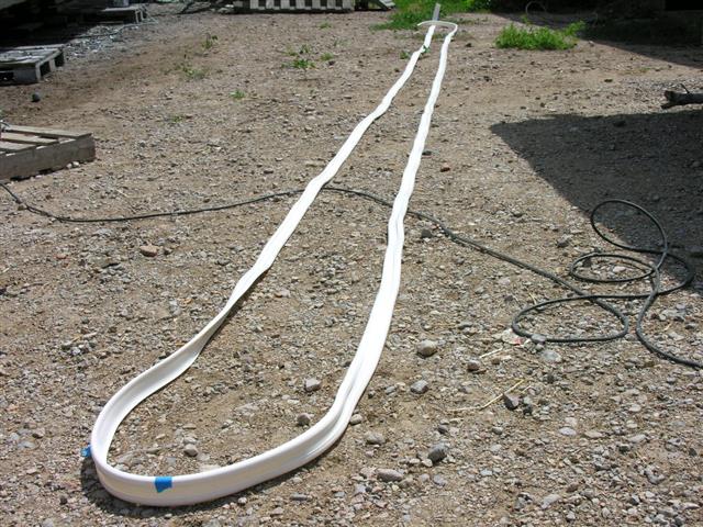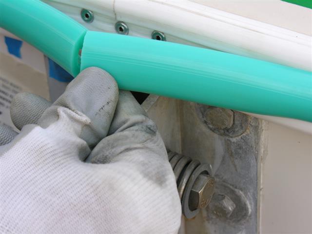 4º Manteniendo el tramo por el trazado más recto, y siempre bajo una ligera tensión, se situará en el extremo de Popa, en su lugar definitivo, justo en la Aleta de Popa, y seguidamente se procederá a su fijación definitiva (foto izda.). Una vez fijado el tramo por Proa y por la Aleta de Popa, el perfil quedará situado en la forma que se aprecia en la foto de la derecha.