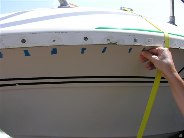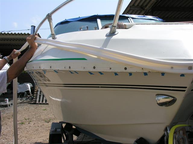 2º Una vez el perfil haya alcanzado su temperatura óptima de montaje y adquirido una textura totalmente elástica al tacto, se procederá a fijarlo por su punto central (marcado en este caso con cinta azul), en su emplazamiento definitivo en el centro de la Proa de la embarcación. (foto izda.)