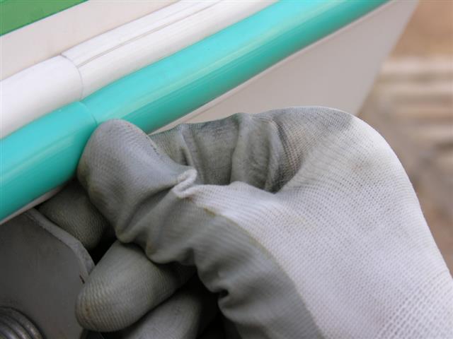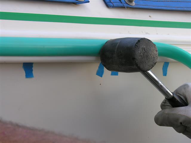 9º Una vez fijado todo el perfil de base, se procederá a la colocación progresiva de la Tapa de Protección, partiendo, por ejemplo, desde la Proa y hacia cada uno de los extremos, siempre en la misma dirección. En este caso, el sistema habitual consiste en ir situando progresivamente la tapa en la acanaladura prevista, con las manos, o con la ayuda de un destornillador plano y romo, y seguidamente asegurar su perfecto encaje y ensamblado en el perfil de base con la ayuda de una maza de Teflón, o similar. A diferencia del perfil de base, la tapa actuará como un elemento "flotante", encajado en su propia acanaladura, siguiendo fielmente la línea del perfil de base, por lo que no es conveniente proceder a su montaje con ningún tipo de tensión sobre la misma, sino dejando que se coloque de forma "natural", en su lugar.